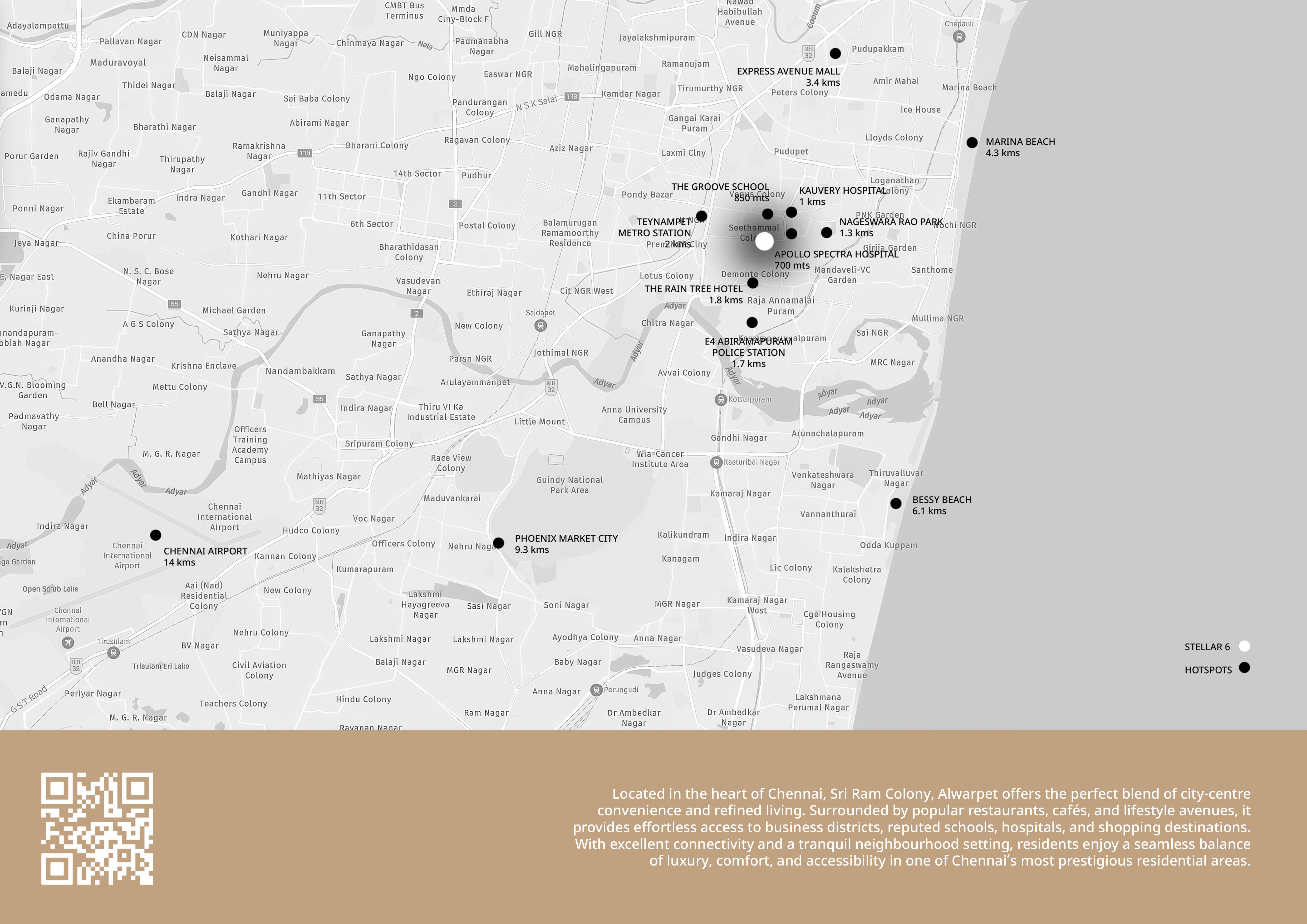 Located in the heart of Chennai, Sri Ram Colony, Alwarpet offers the perfect blend of city-centre convenience and refined living. Surrounded by popular restaurants, cafés, and lifestyle avenues, it provides effortless access to business districts, reputed schools, hospitals, and shopping destinations. With excellent connectivity and a tranquil neighbourhood setting, residents enjoy a seamless balance of luxury, comfort, and accessibility in one of Chennai’s most prestigious residential areas.